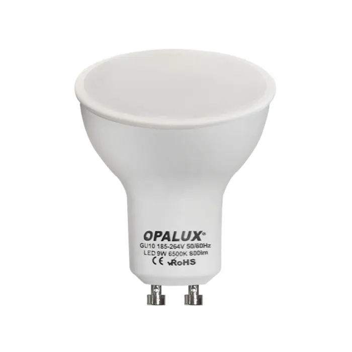 FOCO DICROICO LED 9W GU10 120° LUZ CALIDA “OPALUX” 800LM 3000K 185-264VAC Ø5CM 5.7CM ALTO.