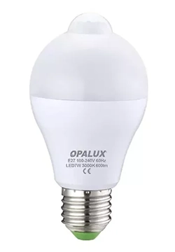 FOCO LED 7W LUZ CALIDA “OPALUX” C/SENSOR DE MOV.NOCTURNO 3000K 600LM 360° E27 110-240VAC FACTOR 0.9 CJX50